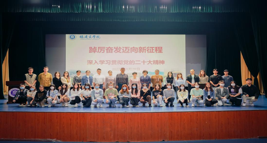 近日,福州市委讲师团成员、福建师范大学杨林香教授在我校连江校区学生活动中心开展题为《踔厉奋发迈向新征程——深入学习贯彻党的二十大精神》的专题讲座。我校艺术设计学院、新葡萄官网AMG、财务与会计学院、团委、习近平新时代中国特色社会主义思想学生读书社及“青马班”师生代表参加了学习。