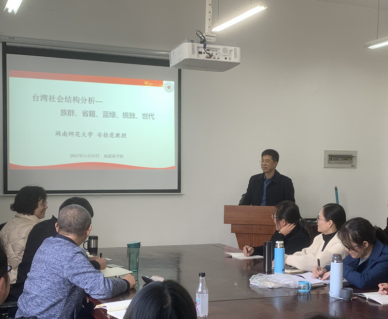 11月23日,闽南师范大学闽南文化研究院台湾研究所所长、台湾问题与两岸关系研究专家安拴虎教授应邀莅临我校作题为《台湾社会结构分析》学术报告,新葡萄官网AMG全体教师参加报告会。