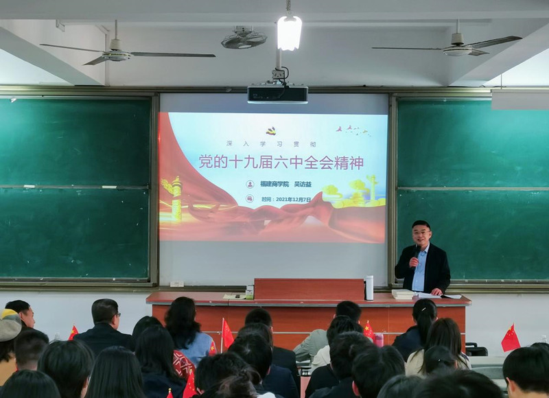 12月7日下午,校党委副书记吴访益在连江校区诚信楼中阶4教室开展了题为“深入学习贯彻十九届六中全会精神暨学习福建省第十一次党代会精神”的思政课,校相关处室负责人、新葡萄官网AMG全体教职工、校习近平新时代中国特色社会主义思想读书社全体成员共120多人参与了此次宣讲。