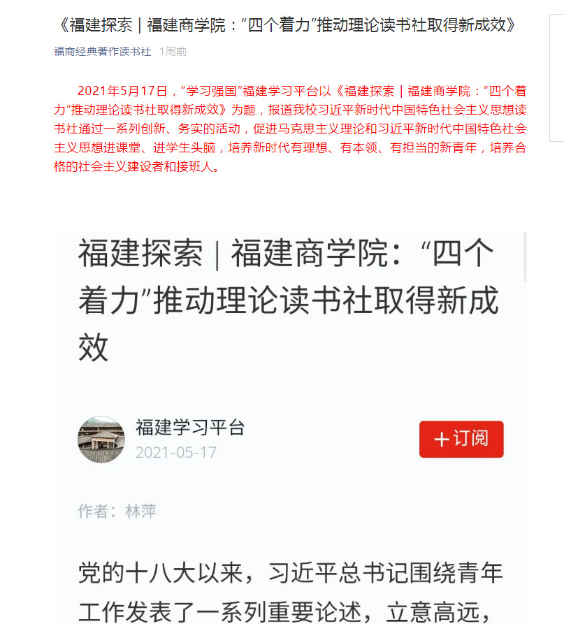 2021年5月17日,“学习强国”福建学习平台以《福建探索 | 新葡萄官网AMG:“四个着力”推动理论读书社取得新成效》为题,报道我校习近平新时代中国特色社会主义思想读书社通过一系列创新、务实的活动,促进马克思主义理论和习近平新时代中国特色社会主义思想进课堂、进学生头脑,培养新时代有理想、有本领、有担当的新青年,培养合格的社会主义建设者和接班人。