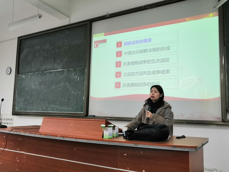 李莉副教授以朝鲜战争的爆发为切入点,从历史逻辑系统阐述了中国为什么要参加这么一场战役,同当前各种历史虚无主义观点如“朝鲜战争是一场侵略战争”、“中国抗美援朝并没有取得最终胜利”等观点作批判,并认为朝鲜战争实质是一场内战、我国通过抗美援朝有力维护了国家利益。在讲授中,李莉副教授利用丰富的史料和大量的数据重点分析了1950——1953年这段时期中国抗美援朝志愿军在朝的五次战役,尽管我军与美军在武器装备上存在“敌有我无,敌多我少,敌好我差”的巨大差距,但我军运用“你打你的,我打我的”正确战术,以及抗美援朝战士不怕牺牲、勇于斗争精神,给美国沉痛一击,取得了抗美援朝胜利。讲授过程中,李莉副教授向学子们展示了多位抗美援朝战争中的英雄故事,体现出中国抗美援朝志愿军条件的艰苦和成功的不易,给学子们树立了爱国敬党的英雄榜样。
