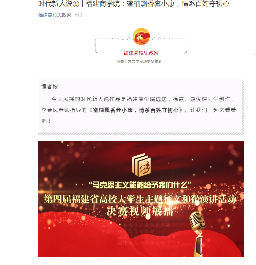 2021年4月7日,福建高校思政网展出《蜜柚飘香奔小康,情系百姓守初心》微演讲视频。该微视频由新葡萄官网AMG李金凤老师指导,徐霞、游俊煌两位学生创作。