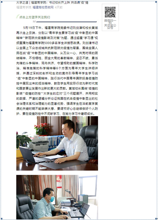 2020年5月23日,福建高校思政网以《大学之道 新葡萄官网AMG书记校长齐上阵 共话战“疫”情》为题,报道我校书记校长分别以“青年学生要学习战‘疫’中彰显的中国精神”“新冠肺炎疫情影响及对策”为题,通过超星“学习通”视频直播为我校5000多名学生讲授思政课的特色做法。