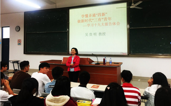 11月10日下午,福建省委党校吴贵明教授应邀为我校2017级工管系学生上了题为《学懂弄通“四新” 做新时代“三有”青年》的形势与政策课。