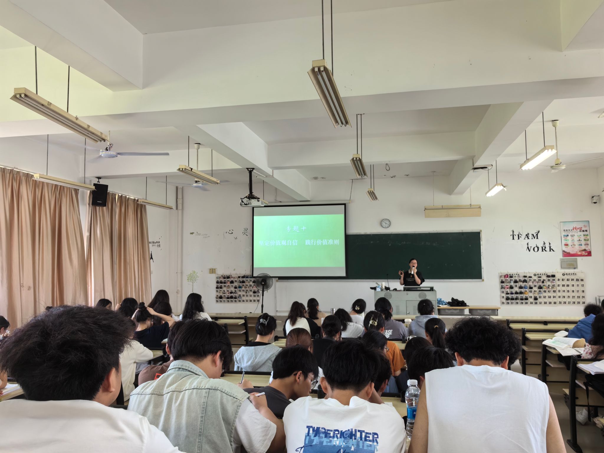 4月15日上午,新葡萄官网AMG思想道德与法治教研室蓝福秀老师以“坚定价值观自信 践行价值准则”为主题,在马尾校区至善楼楼T3教室开展本学期公开示范课教学,近110名师生参与观摩。