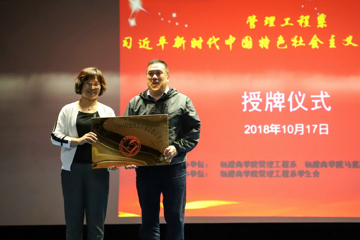 在读书社成立仪式上,林萍教授代表学校习近平新时代中国特色社会主义思想读书社向管理工程系授牌,宣告管理工程系习近平新时代中国特色社会主义思想读书正式成立。魏仁兴教授在致辞中指出,当代大学生必须自觉用习近平新时代中国特色社会主义思想武装头脑、指导学习和实践,不断增强“四个意识”、坚定“四个自信”,勇做新时代的弄潮儿。他希望管理工程系学子要充分利用好系读书社这一学习平台,积极投身习近平新时代中国特色社会主义思想相关著作的学习,认真掌握习近平新时代中国特色社会主义思想精髓;通过学习提高思想水平,促进专业知识学习,形成良好学风,展现出新时代青年学生的精气神。