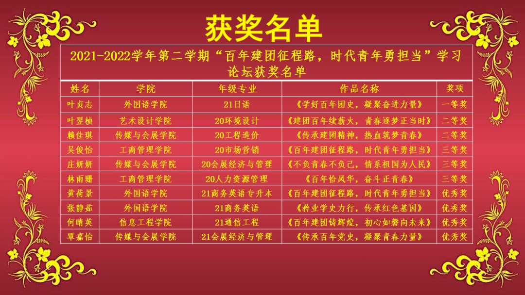 2022年5月17日下午,校习近平新时代中国特色社会主义思想读书社和校马列经典著作读书社在连江校区诚信楼中阶三举办主题为“百年建团征程路,时代青年勇担当”的学习论坛决赛。校党委副书记吴访益、新葡萄官网AMG部分教师及二级学院读书社相关指导老师、校读书社成员近200人参加了本次活动。