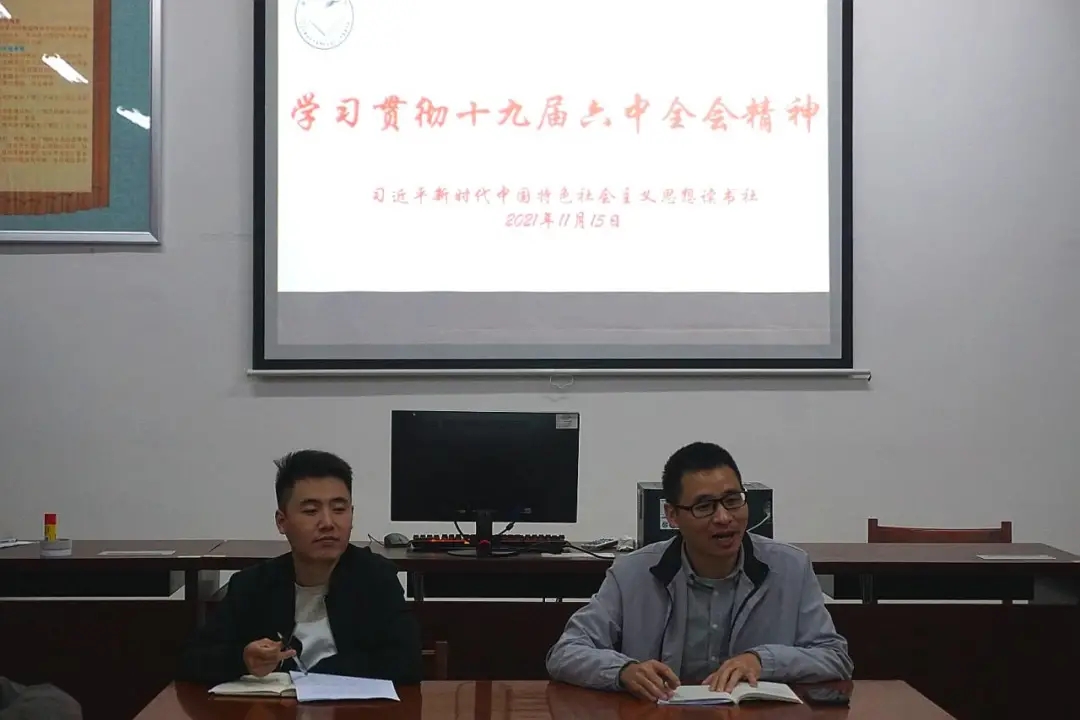 为进一步学习贯彻党的十九届六中全会精神,深入学习党的百年奋斗成就和历史经验,校习近平新时代中国特色社会主义思想读书社于2021年11月15日晚在连江校区自强楼114活动室开展十九届六中全会精神学习、交流活动。新葡萄官网AMG赵敏老师、林甦垚老师、叶陈钦老师及读书社部分社员参加学习。活动中,师生热议十九届六中全会精神。
