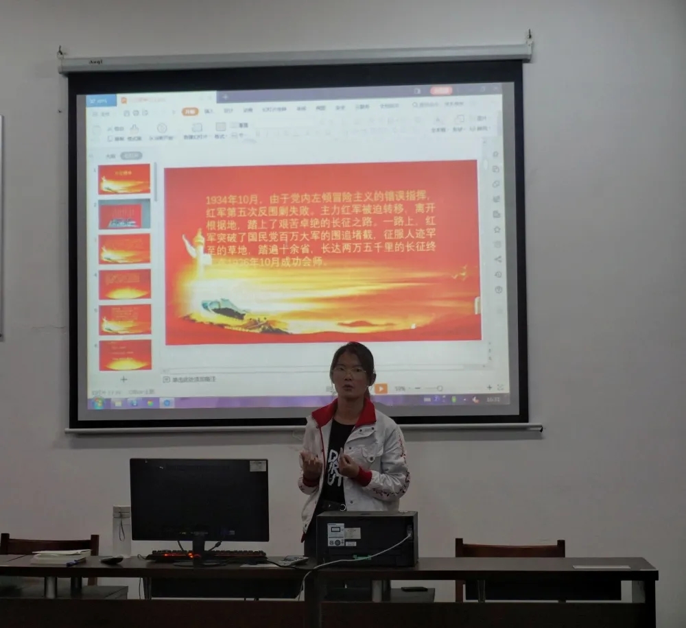 为进一步在青年大学生中深入学习贯彻习近平新时代中国特色社会主义思想,特别是深入学习领会党的十九届六中全会精神,理解中国共产党在百年奋斗中取得的伟大成就和历史经验,宣传中国共产党在百年奋斗中构建的中国共产党人的精神谱系,传承中国共产党人在中华民族伟大复兴征程中体现出的爱国情怀、高尚品格和精神风骨,汲取奋进力量,2021年11月22日下午,校读书社曹海艳同学在自强楼读书社活动室开展了题为“弘扬长征精神,传承红色基因”的宣讲活动,分享了自己的学习心得与感悟。共有30多位学生参加此次学习活动。